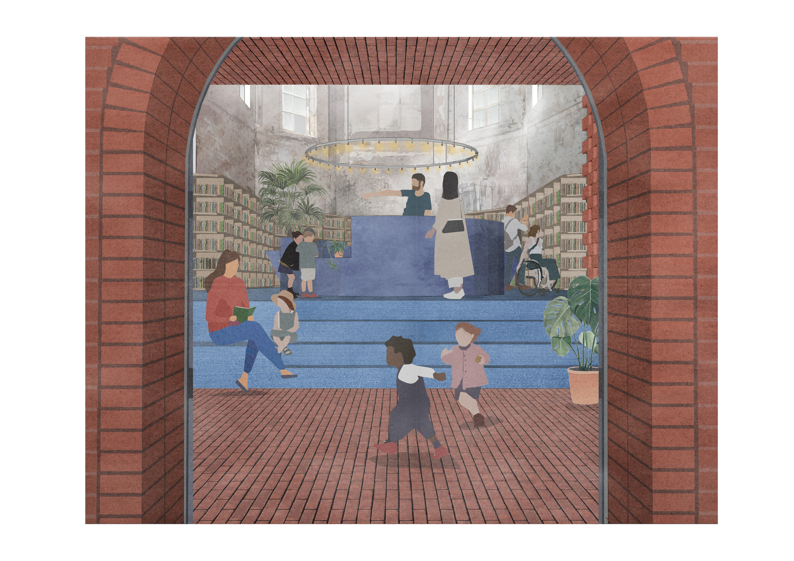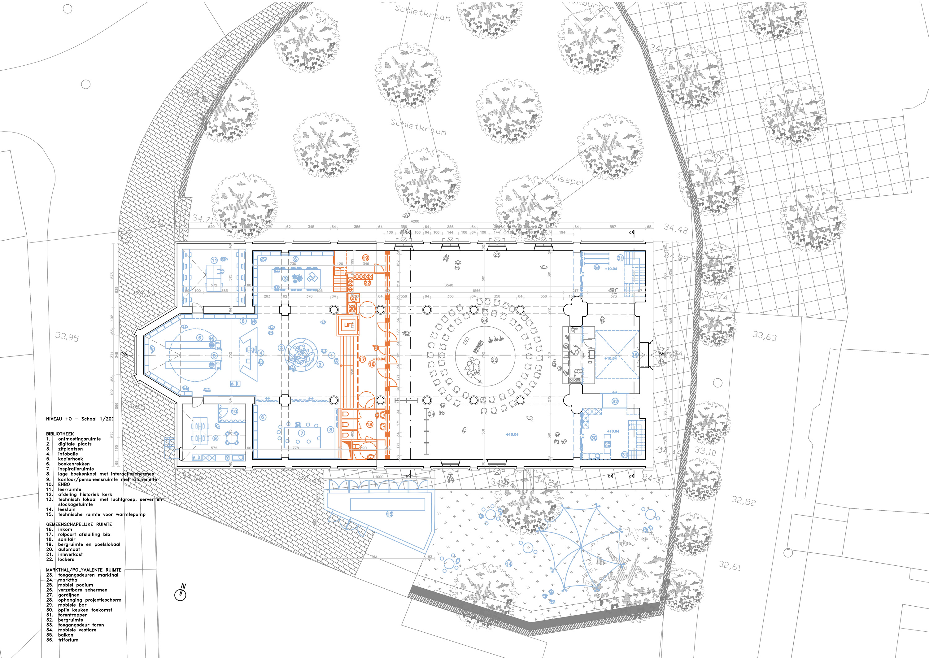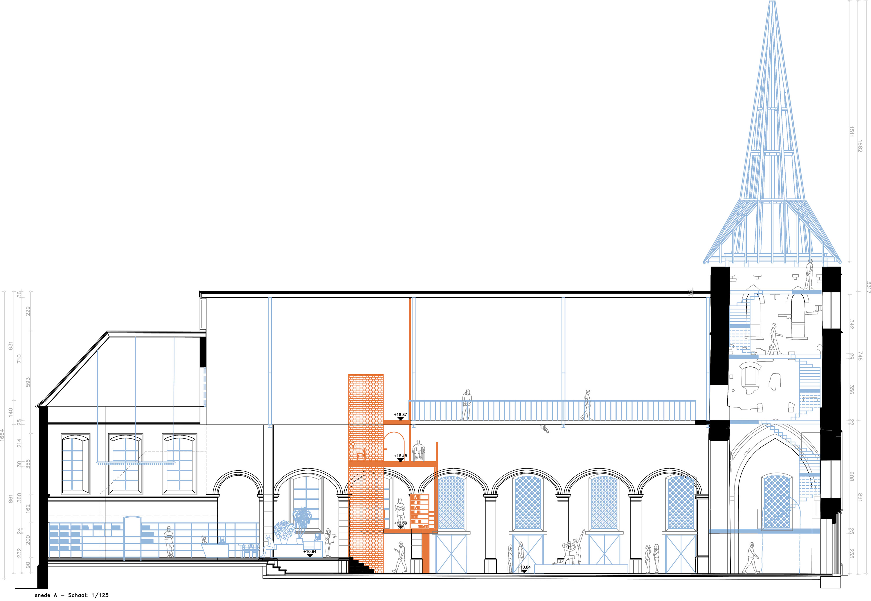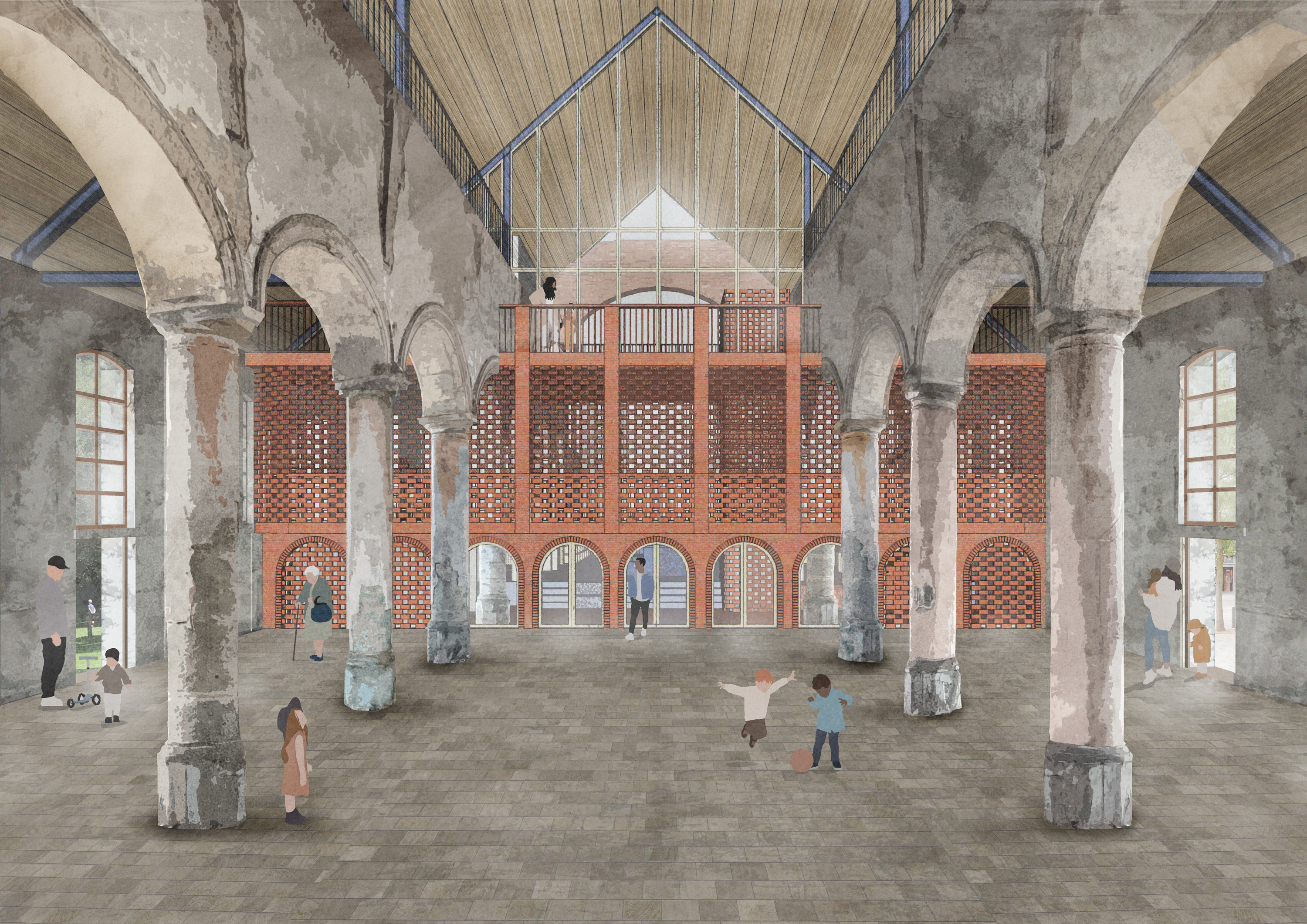 De monumentale kenmerken van de kerk, zoals symmetrie, hoogte, lichtinval en ritme, blijven behouden, evenals bouwsporen die door een brand zichtbaar werden. In de bibliotheek wordt een lichte vloer en nieuwe lambrisering aangebracht om toekomstig gebruik te faciliteren. De kerkruimte van vóór 1910 wordt opnieuw een publieke polyvalente ruimte met verbeterde verhoudingen, nieuwe verbindingen naar marktplein en tuin, en galerijen voor zaaltechnieken.