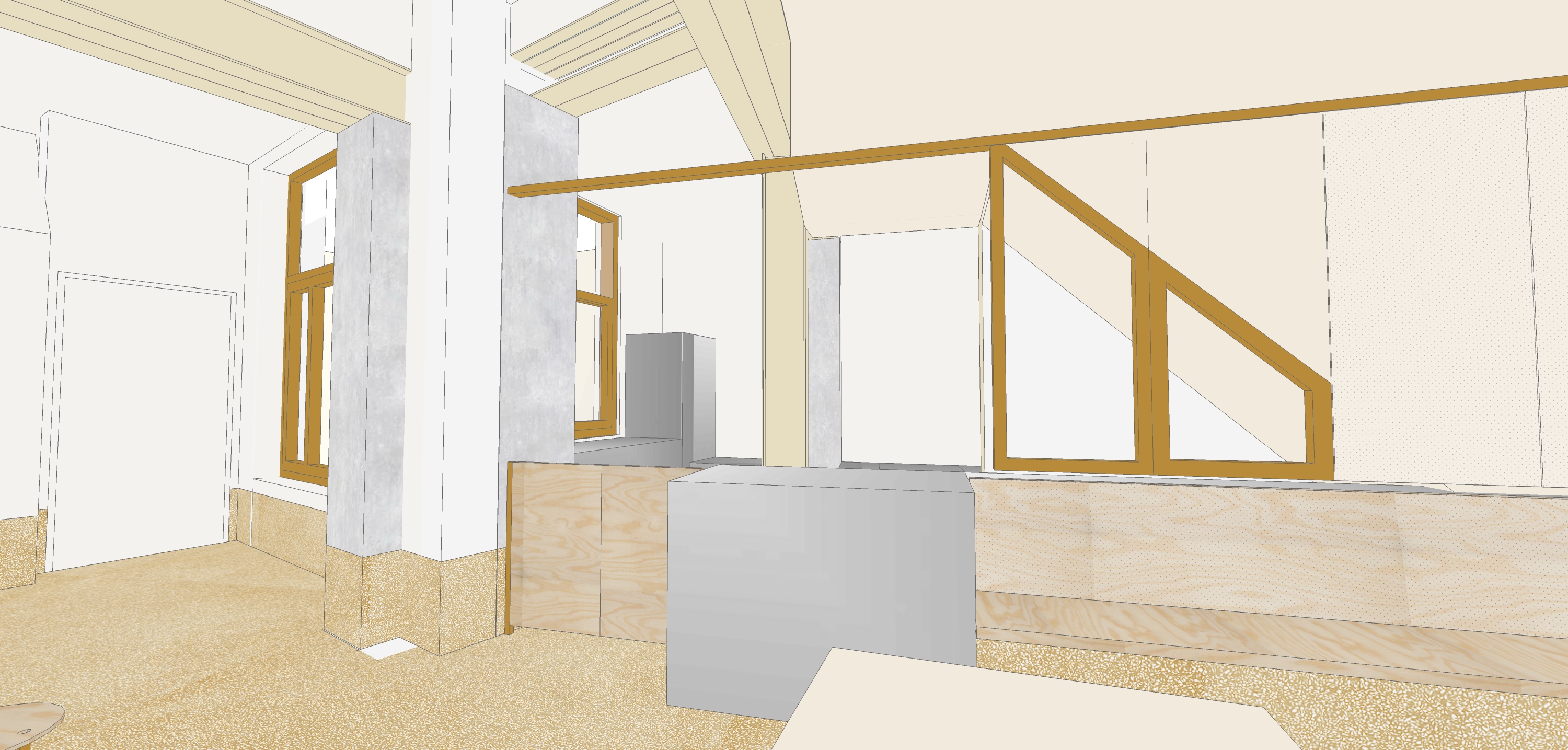 The client invites homeless people for meals, to connect and support them. Together with users, issues in the existing spaces were analyzed. The ground floor opens into an elongated dining hall with concrete columns and exposed steel structure; the kitchen is placed sideways in a renewed extension. Level differences disappear, and the stair is positioned to maintain overview.The five housing units above gain a larger entrance with stairlift through the carriage gate. At the back, an inclusive toilet and access to semi-public areas, offices, and meeting rooms are provided. Toilets are located at -1,storage spaces in the cellar. Benches act as air plenums, a sliding wall separates the kitchen and improves acoustics. Heating is provided by heat pump and solar panels, the rear façade is insulated. The project arose from collaboration between Vlaams Brussel Fonds, VGC, and owner CSW.