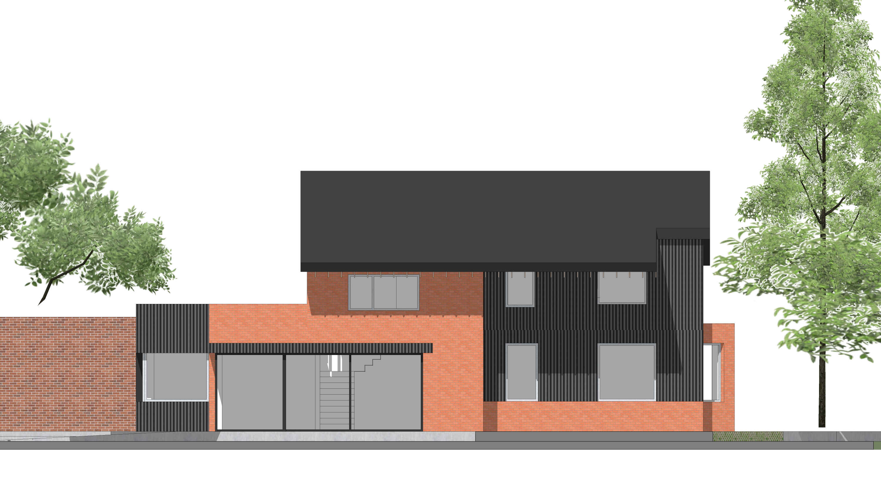 Traditionele dorpse elementen zoals plint en erker worden geïntegreerd in een hedendaagse verbouwing van een ééngezinswoning in Oud-Heverlee. Een nieuw asymmetrisch zadeldak verbindt bestaand en nieuw volume en is geoptimaliseerd voor zonnepanelen en zonnewering. De uitbreiding in houtskeletbouw krijgt een bakstenen afwerking en richt zich met grote raampartijen op de tuin. Een groot raam op de verdieping en een vide met oplopende trap brengen licht en verhogen de ruimtelijkheid in het hart van de woning. Toegankelijkheid en duurzaamheid staan centraal, met onder meer een verlaagde vloer, bredere deur, warmtepomp, geothermie, hoge isolatie, vloerverwarming en hergebruik van regenwater. De woning is voorbereid op toekomstig kangoeroewonen.